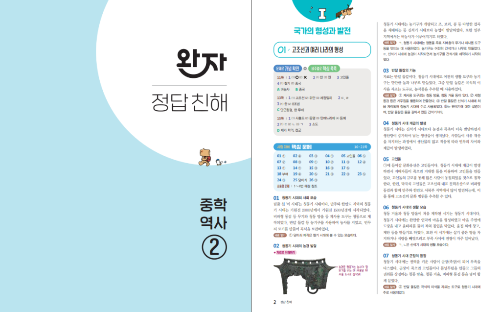 이 책은 고조선과 여러 나라의 형성, 삼국과 가야의 성장, 통일 신라와 발해, 고려와 조선의 성립과 변화, 조선 후기사회, 근대 국가 수립과 민주주의 발전까지 시대 흐름에 따라 단원을 나누어 구성했습니다. 각 단원 안에서는 주제별로 개념을 묶어, 사건 이름이나 연도만 외우는 것이 아니라 왜 그런 일이 일어났는지, 앞뒤 시대와 어떤 관련이 있는지를 함께 이해하도록 돕습니다. 또 교과서에 나오는 지도, 사진, 표, 그래프 같은 핵심 자료를 그대로 가져와 설명하기 때문에 시험에 자주 등장하는 사료와 도표 문제에 자연스럽게 익숙해질 수 있습니다. 아래 링크를 통해 중학역사2 완자 답지를 열람할 수 있습니다.