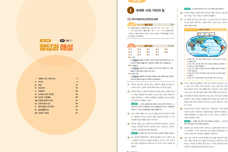 범위를 보면 1학년 사회의 큰 축이 거의 한 번에 들어가 있습니다. 앞부분은 세계화 시대의 지리, 아시아·유럽·아프리카·아메리카·오세아니아 같은 세계 지리 단원으로 이어지고, 뒤쪽은 인간과 사회생활, 문화 이해, 민주주의, 정치 참여, 법, 인권과 기본권까지 시민 영역을 다룹니다. 즉 세계지리 + 시민이 한 권에 묶인 형태라서, 1학년 사회를 전체 흐름으로 복습하거나 2학년 올라가기 전에 기초를 다지기에도 맞습니다. 아래 링크를 통해 중학 사회1 체크체크 답지를 열람할 수 있습니다.