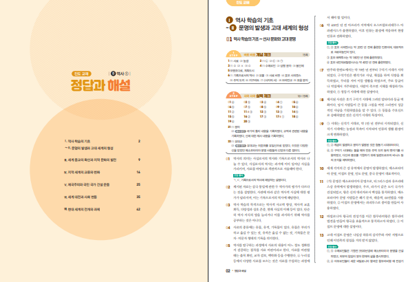 구성은 진도 교재와 시험 대비 교재, 그리고 정답과 해설로 나뉘어 있습니다. 진도 교재에서는 제국주의와 국민 국가 건설 운동, 세계 대전과 사회 변동, 현대 세계의 전개와 과제처럼 단원 자체가 길고 복잡한 파트를 다룹니다. 유럽과 아메리카의 국민 국가 체제 형성, 산업화와 제국주의, 아시아·아프리카의 민족 운동 같은 내용이 이어지니, 한 단원씩 끝낼 때마다 요점 정리 페이지로 핵심 키워드를 다시 묶어두면 기억이 오래 갑니다. 아래 링크로 체크체크 중등 역사 1-2 답지를 열람하실 수 있습니다.