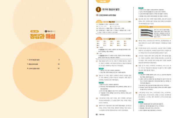 구성도 직관적입니다. 진도 교재에서는 고조선과 여러 나라, 삼국과 가야의 성립과 발전, 문화와 대외 교류처럼 시험에 꼭 나오는 핵심 포인트를 먼저 잡고, 통일신라와 발해의 성립과 발전, 문화까지 한 덩어리로 정리합니다. 그다음 고려의 성립과 통치 체제, 정치 변화와 대외 관계, 몽골 간섭과 개혁, 대외 교류와 문화까지 이어지는데, 시대가 바뀌는 지점마다 헷갈리기 쉬운 용어가 많아서 요점 정리 부분을 자주 되돌아보는 게 도움이 됩니다.
