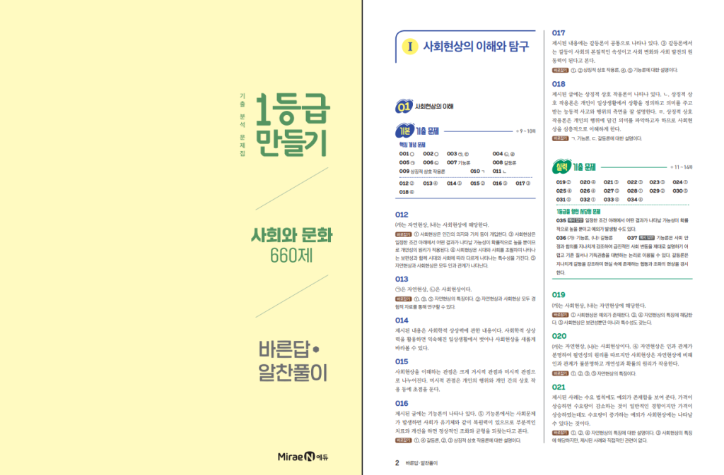 구성은 ‘사회현상의 이해와 탐구’로 시작해 연구 방법, 자료 수집, 가치 중립과 연구 윤리를 체계화합니다. 이어 ‘사회 구조와 사회 변동’에서 개인과 사회의 관계, 집단·조직의 특징, 일탈과 사회 통제, 사회 운동까지 맥락을 따라 정리합니다. 각 절은 교과 개념과 실제 자료를 엮어 출제 포인트를 명확히 짚어 주며, 기본 개념을 확인하는 문제로 개념의 빈틈을 빠르게 메우도록 돕습니다. 아래 링크를 통해 일등급 만들기 사문 답지를 열람할 수 있습니다.