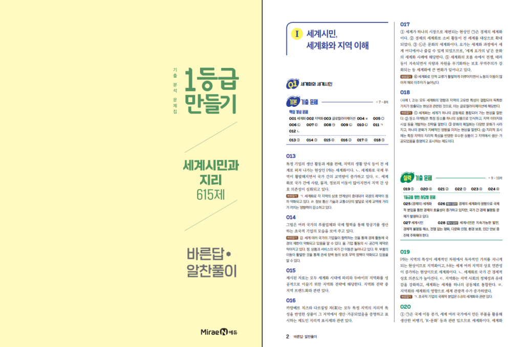1등급 만들기 세계시민과 지리 615제는 2022 개정 교육과정을 충실히 반영한 내신 실전형 기출 분석 문제집입니다. 학교 시험에서 자주 다루는 핵심 개념과 자료를 먼저 정리하고, 즉시 연결된 확인 문제로 이해도를 점검할 수 있도록 구성했습니다. 한 권에 615문항을 담아 양과 질을 동시에 확보했으며, 단답형부터 서술형까지 내신의 실제 문항 형식을 충실히 재현해 시험장에서 흔들리지 않는 풀이 루틴을 익히게 합니다. 아래 일등급 만들기 세계시민과 지리 답지를 pdf 파일로 올려두도록 하겠습니다. 교육과정이 바뀌었으므로 표지를 확인하시길 바랍니다.