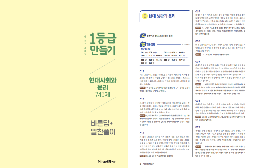 구성은 ‘현대 생활과 윤리’에서 윤리학의 기본 틀과 현대 윤리 쟁점을 잡고, ‘생명윤리·생태윤리’에서 출생·죽음, 성 윤리, 자연과 생태의 문제를 심화합니다. 이어 ‘과학과 디지털 학습 환경 윤리’에서 과학 기술, 정보 사회, 인공지능의 윤리적 함의를 다루며, ‘민주시민과 윤리’에서는 직업 윤리, 사회 정의, 국가와 시민의 관계를 연결합니다. ‘문화·경제생활의 윤리’와 ‘평화·공존의 윤리’ 단원에서는 대중문화와 소비, 다문화, 사회 통합·남북 평화·국제 윤리로 확장하여 현대사회의 실제 이슈를 교과 개념과 함께 바라보게 합니다. 아래 링크를 통해 일등급 만들기 현사윤 답지를 열람할 수 있습니다.
