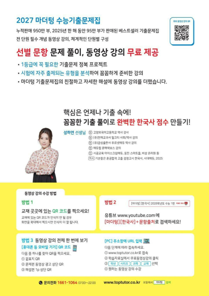 수능 한국사는 만점을 목표로 하기보다 안정적으로 목표 등급을 확보하는 것이 중요한 과목입니다. 그래서 지나치게 많은 자료를 보는 것보다 믿을 만한 기출 교재를 반복하는 편이 더 효율적입니다. 이 책은 실제 시험과 비슷한 방식으로 풀어볼 수 있어서 실수를 줄이고 시험 감각을 끌어올리는 데 도움이 됩니다. 한국사를 빠르게 정리하고 싶은 학생, 시험 직전 최종 점검이 필요한 학생, 기출 반복으로 자신감을 만들고 싶은 학생에게 추천할 만합니다. 강의와 함께 활용하면 이해가 더 쉬워서 매우 좋습니다. 매년 개정되므로 표지 확인하시고, 본문에 2027 수능 대비 마더텅 기출모의고사 한국사 25회 답지 pdf 첨부해두었습니다.