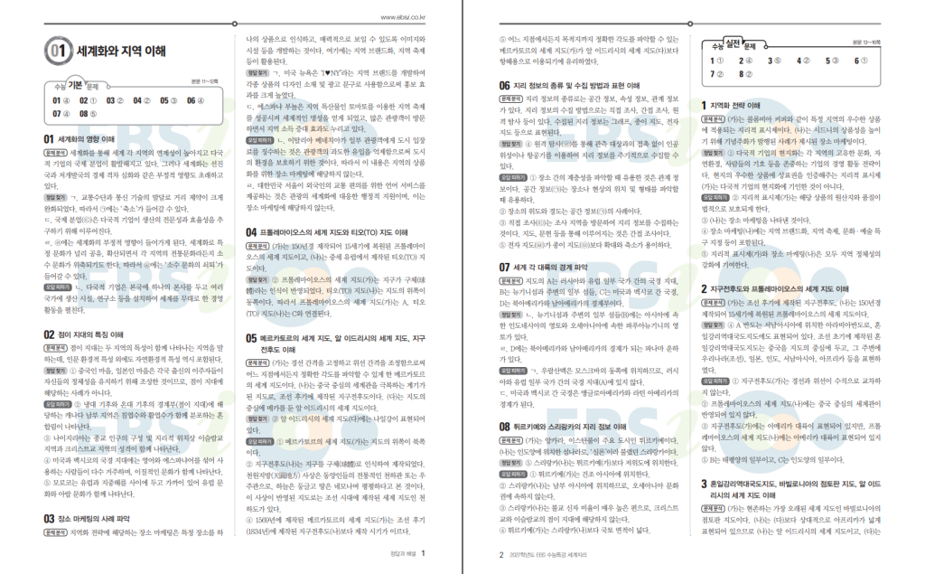EBS 수능특강 사회탐구영역 세계지리는 2027학년도 수능을 준비하는 학생이 세계지리의 큰 흐름을 잡고, 자료형 문제까지 한 번에 대비하도록 만든 연계 교재입니다. 세계지리는 외울 것이 많아 보이지만, 실제로는 기후와 지형, 인구와 도시, 자원 이동 같은 원리를 이해하면 훨씬 쉬워집니다. 이 책은 그 원리를 단원 순서대로 정리해 주고, 문제로 바로 확인하게 해 주는 점이 장점입니다. 아래 수특 세지 답지 pdf 올려두겠습니다. 표지를 꼭 확인하시길 바랍니다.