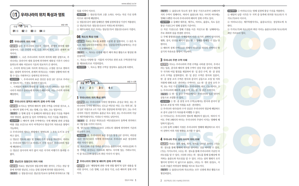 구성은 국토 인식과 지리 정보로 시작해 지형 환경, 기후 환경, 거주 공간과 지역 개발, 생산과 소비의 공간, 인구 변화와 다문화 공간, 지역 이해까지 폭넓게 이어집니다. 우리나라의 위치 특성과 영토처럼 기본 개념을 먼저 잡고, 산지 지형과 하천 지형, 해안 지형, 화산과 카르스트 지형처럼 지형 파트를 단계적으로 쌓아가는 방식이라 이해가 자연스럽습니다. 이어서 기후 특성과 주민 생활, 자연재해와 기후 변화처럼 최근 출제 경향에서 자주 다루는 주제도 정리되어 있고, 도시 구조와 대도시권, 교통·통신 발달과 서비스업 변화처럼 자료형 문제로 연결되는 단원도 포함되어 있어 실전 대비에 도움이 됩니다. 아래 링크로 한지 수특 답지를 열람하실 수 있습니다.