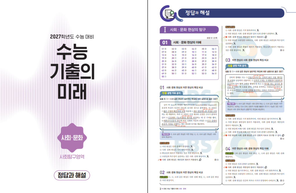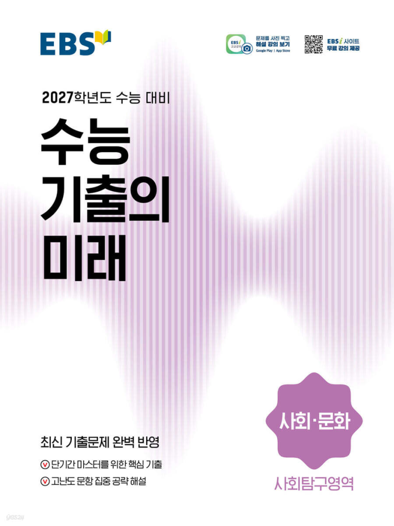 EBS 수능 기출의 미래 사회탐구영역 사회·문화는 2027학년도 수능을 대비해 사회·문화를 기출 중심으로 정리할 수 있도록 만든 교재입니다. 사회·문화는 개념 이해도 중요하지만, 자료 해석과 개념 적용 과정에서 실수가 많이 발생하는 과목입니다. 이 교재는 최근 7개년 수능과 모의평가, 학력평가 기출을 바탕으로 반복 출제되는 유형을 정리해 주어, 문제를 풀면서 자연스럽게 출제자의 의도를 익히도록 구성되어 있습니다. 개념을 어느 정도 공부한 학생이 실전 감각을 키우기에 적합하며, 문단 말미에 사문 수능 기출의 미래 답지 pdf 올려두겠습니다.