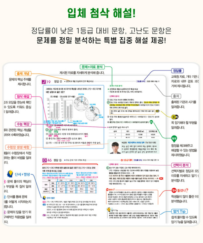 상위권을 노리는 학생에게도 장점이 큽니다. 어려운 문제가 자주 나오는 단원은 1등급 대비, 고난도 대비로 분리해 따로 훈련하게 해줍니다. 고난도 문제 특강에서는 단서 찾기, 발상, 적용 같은 사고 과정을 해설로 풀어주기 때문에 왜 틀렸는지를 정확히 짚을 수 있습니다. 여기에 최신 연도별 모의고사 10회가 등급컷과 함께 원본 형태로 수록되어 실전 연습이 가능합니다. 또 수험장 극비노트가 빈출 주제를 그림과 도표로 정리해 주어, 막판 암기 정리에도 도움이 됩니다.