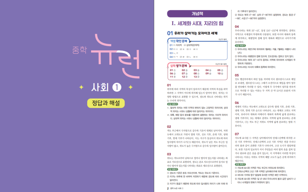 이 교재는 세계화와 지리 영역부터 시작해 아시아, 유럽, 아프리카, 아메리카 등 지역 이해를 거쳐 사회생활, 문화, 민주주의, 법과 인권까지 단계적으로 확장되는 구조입니다. 단순 암기보다는 전체 흐름을 이해하도록 구성되어 있어 시험 대비뿐 아니라 기본 개념을 잡는 데 효과적입니다. 아래 링크로 중학 EBS 뉴런 사회1 답지를 열람하면서 문제 풀이 후 바로 확인하는 방식으로 학습하면 더 도움이 됩니다.