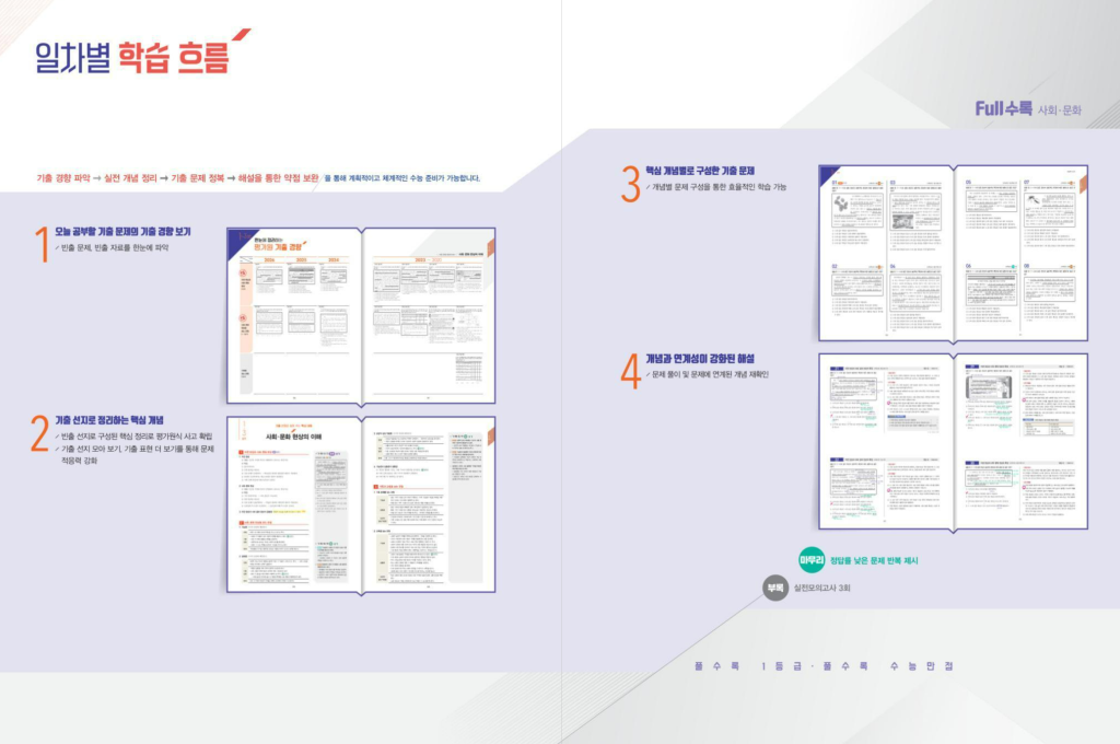 활용 팁은 단순합니다. 1회독은 속도보다 정확도를 우선해서 틀린 이유를 ‘개념 부족’인지 ‘자료 해석 실수’인지로 나눠 적어 두면 2회독부터 점수가 빨리 올라갑니다. 사문은 같은 주제가 다른 자료로 반복되기 때문에, 오답만 잘 모아도 실력이 확 올라가는 과목입니다. 강의와 함께 한다면 개념 정리는 강의로 빠르게 끝내고, 이 책으로 기출을 회독 돌리는 방식이 매우 좋습니다. 매년 개정되므로 표지 확인은 꼭 하시는게 좋습니다. 본문에 2027 수능대비 FULL수록 기출문제집 사회문화 답지 pdf 첨부해 두었으니 필요할 때 바로 활용하시면 됩니다.