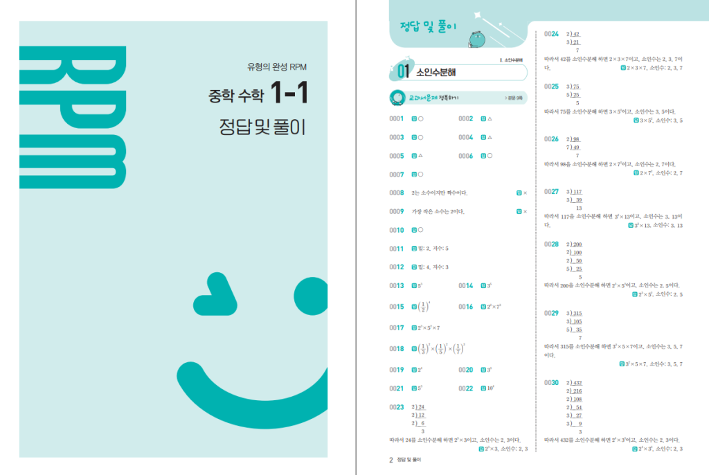 공부할 때는 하루에 많은 문제를 풀기보다는 정해진 분량을 정확하게 풀어보는 방식이 잘 맞습니다. 틀린 문제는 바로 답을 확인하기보다, 어떤 계산이나 조건에서 실수했는지를 먼저 표시해 보는 것이 도움이 됩니다. 특히 소인수분해나 정수 계산처럼 기초가 되는 단원은 풀이 과정을 또박또박 적는 습관을 들이면 이후 단원에서도 실수가 줄어듭니다. 정답과 해설은 보통 함께 제공되므로, 복습용으로 활용하기에도 좋습니다.