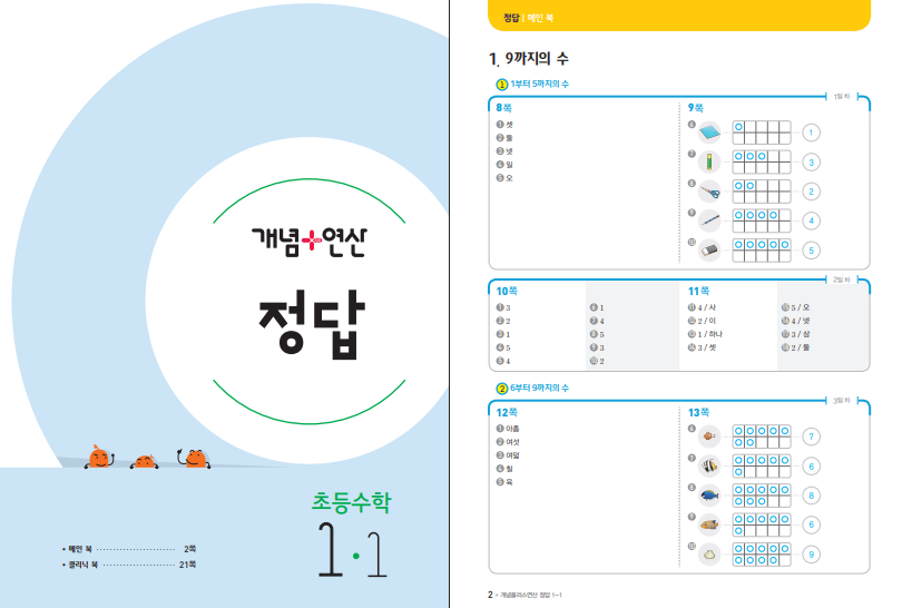 이 책의 특징은 제목 그대로 개념과 연산을 한 권에서 끝내게 했다는 점입니다. 보통 1학년 수학은 “개념은 쉬운데 계산은 느린” 경우가 많고, 반대로 “계산은 하는데 왜 그렇게 되는지 모르는” 경우도 있는데, 이 교재는 개념을 먼저 한 컷으로 보여 주고, 바로 이어지는 연산 문제에서 그 개념을 계속 쓰게 해서 두 부분이 따로 놀지 않도록 했습니다. 예를 들어 9까지의 수를 배울 때도 그냥 세게만 하지 않고 수의 순서, 1만큼 크고 작은 수, 0의 의미까지 차근차근 반복하게 하여 수 감각을 키워 줍니다.