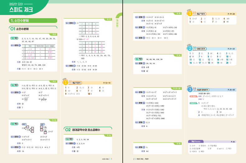 단원 구성은 Ⅰ수와 연산(소인수분해, 정수와 유리수), Ⅱ문자와 식(문자의 사용과 식, 일차방정식), Ⅲ좌표평면과 그래프(좌표·정비례·반비례)로 이어집니다. 각 단원에서 개념–확인문제–기초유형의 흐름이 단단히 연결되어 있어, 정의와 성질을 익힌 뒤 즉시 계산과 적용으로 넘어가며 학습 공백을 줄입니다. [유형편 라이트]에는 계산력 강화를 위한 코너와 ‘쌍둥이 문제’가 포함되어 동일 개념을 두 번 이상 다른 틀로 풀어 보게 하므로, 실수 감소와 개념 고정에 효과적입니다. 자주 출제되는 포인트를 중심으로 배치해 내신 대비의 기본기를 채우기에 좋습니다.