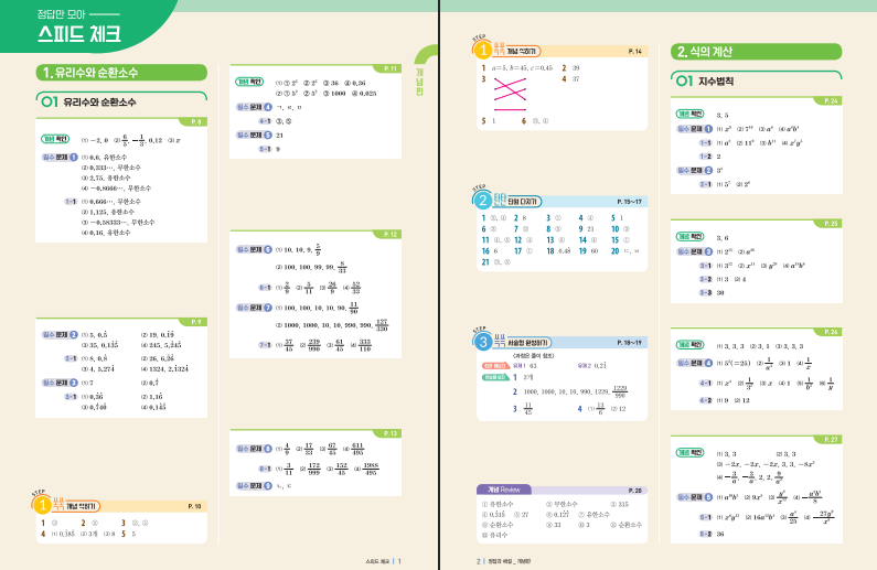 구성은 Ⅰ.유리수·순환소수와 식의 계산, Ⅱ.일차부등식·연립일차방정식, Ⅲ.일차함수와 그래프까지 핵심 축을 고르게 담았습니다. 각 단원은 정의→예제→확인 문제→기초 유형으로 흐름이 매끈하며, ‘쌍둥이 문제’로 같은 개념을 형식만 바꿔 두 번 풀게 하여 실수를 줄이고 개념 고정을 돕습니다. 계산력 보강 코너가 수시로 섞여 있어 분수·부호·식 정리에서의 잔실수 교정에도 효과적입니다. 아래 링크를 통해 개념+유형 라이트 2-1 답지를 열람할 수 있습니다.