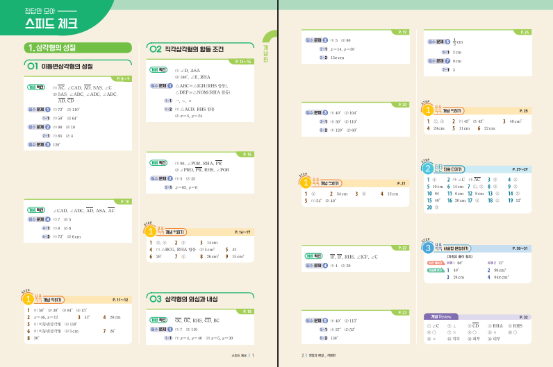 개념편은 교과서의 내용을 바탕으로 핵심 개념을 깔끔하게 정리해 주기 때문에 혼자 공부하는 학생도 따라가기 어렵지 않습니다. 부가 설명과 확인 문제가 바로 이어지면서 중요한 개념을 놓치지 않도록 구성되어 있고, 서술형까지 자연스럽게 연습할 수 있습니다. ‘삼각형과 사각형의 성질’, ‘닮음과 평행선 사이 선분의 길이 비’, ‘피타고라스 정리’처럼 중2에서 가장 어려워하는 도형 개념을 친절하게 풀어 설명해 주는 점도 특징입니다. 개념을 정리한 뒤 바로 문제로 연결할 수 있게 구성되어 있어, 한 단원을 배우고 다음 단계로 넘어가는 흐름이 자연스럽습니다. 아래 링크를 통해 개념+유형 파워 중2-2 답지를 열람할 수 있습니다.