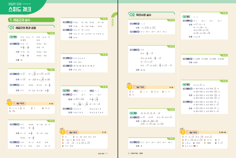 비상교육 개념+유형 실력향상 파워 중학 수학 3-1은 고난도 내신과 고1 초반 선행까지 한 권으로 연결하고자 하는 학생에게 적합한 구성입니다. [개념편]에서 제곱근과 실수, 근호 포함 식의 계산을 촘촘히 다진 뒤, [유형편 파워]로 인수분해·이차방정식, 이차함수까지 난도를 끌어올리는 흐름이 자연스럽습니다. 단원 첫머리의 핵심 정리와 부가 설명이 간결하게 정리되어 있어 개념의 경계를 빠르게 파악할 수 있으며, 서술형 풀이를 단계별로 안내해 답만 적는 공부에서 이유를 설명하는 공부로 전환하도록 돕습니다. 실제 학습에서는 표–식–그래프 전환을 반복하며 기울기·절편, 꼭짓점 해석까지 연결해 개념 사이의 다리를 탄탄히 놓습니다. 아래 개념플러스유형 파워 중3-1 답지 pdf 파일을 올려두도록 하겠습니다.