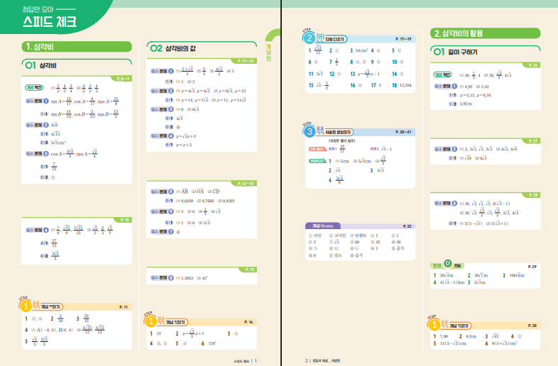 개념편은 복잡하게 느껴질 수 있는 삼각비와 원의 성질을 그림과 설명으로 차근차근 풀어 주기 때문에, 스스로 공부하는 학생도 이해하기 쉽습니다. 개념마다 부가 설명이 함께 들어가 있어 헷갈리기 쉬운 부분을 잡아 줄 뿐 아니라, 개념 확인 문제와 학교 시험 유형 문제가 자연스럽게 연결되어 학습 흐름이 매끄럽습니다. 특히 서술형 문제 접근 방법을 단계별로 안내해 주어, 서술형이 어려운 학생도 어느 정도 자신감을 얻을 수 있는 구성을 갖추고 있습니다. 개념을 빠르게만 훑는 방식이 아니라, ‘왜 이렇게 되는지’를 이해하도록 돕는 방식이기 때문에 예습과 복습용으로 모두 잘 맞습니다. 아래 링크를 통해 개념+유형 파워 중3-2 답지를 열람할 수 있습니다.