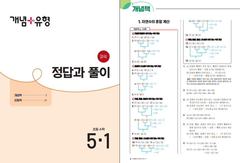 위 링크를 통해 개념플러스유형 파워 5-1 답지를 열람할 수 있습니다. 난이도 분포는 하 15%, 중 40%, 상 30%, 최상 15%로 안내되어 기초 점검부터 심화 도약까지 폭넓게 커버합니다. 쉬운 문항으로 원리를 확인한 뒤 변형·통합 문항에서 조건을 구조화하고, 문장제에서는 단위·관계·식 세우기를 반복 훈련합니다. 특히 ‘대응 관계’와 ‘분수의 연산’ 파트의 상위권 문항은 표·식·그래프를 오가며 해석하는 힘을 요구해, 수학적 의사소통과 사고력을 함께 강화합니다. 오답 정리는 개념책 해당 항목으로 즉시 회귀하는 루틴을 권장하며, 같은 유형을 다른 수치로 다시 풀어 보는 1:1 복습이 효과적입니다.