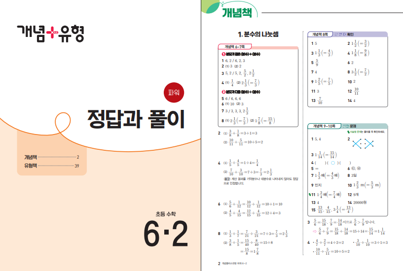 개념책은 분수의 나눗셈과 소수의 나눗셈처럼 많은 학생들이 헷갈려 하는 단원을 비교적 차분하게 풀어 설명해 줍니다. 왜 이렇게 계산해야 하는지, 계산 순서가 어떻게 되는지를 말로 설명해 주기 때문에 공식만 외우는 공부가 되지 않습니다. 공간과 입체, 원의 둘레와 넓이 같은 도형 단원도 단순 암기보다 개념의 연결을 중시하여, 이전 학년에서 배운 내용과 자연스럽게 이어지도록 구성되어 있습니다. 특히 6학년 2학기 수학은 중학교 기하와 비례 개념의 기초가 되는 부분이 많아, 이 시기에 개념을 정확히 이해하는 것이 중요합니다. 이 교재는 그런 점에서 개념 정리에 충실한 편입니다. 아래 링크를 통해 개념+유형 파워 6-2 답지를 열람할 수 있습니다.