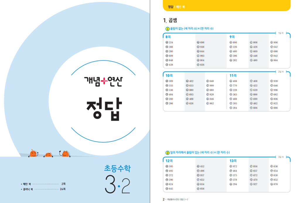 활용할 때는 하루에 너무 많은 양을 풀기보다 한 단원씩 개념을 확인하고 비슷한 문제를 반복해 손에 익히는 방식이 좋습니다. 틀린 문제는 그냥 넘어가지 말고 왜 틀렸는지 짧게 다시 보고, 다음 날 비슷한 문제를 한 번 더 풀게 하면 실수가 많이 줄어듭니다. 3학년 2학기 수학은 이후 분수와 나눗셈, 자료 해석으로 이어지는 중요한 바탕이 되기 때문에 지금 정확하게 잡아 두는 것이 중요합니다. 학습연도를 표지로 확인하시기 바랍니다. 본문에 22개정 개념 플러스 연산 초등 수학 3-2 답지 pdf 첨부해 두었습니다.