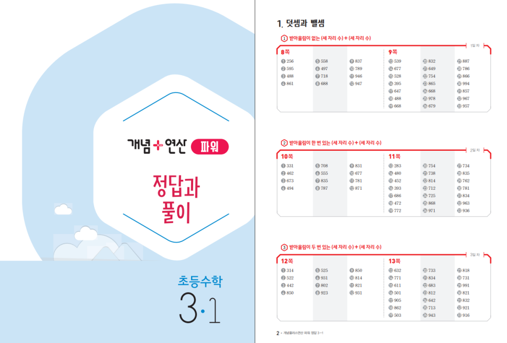 개념+연산 파워 초등수학 3-1은 수학을 조금 더 탄탄하게 잡고 싶은 초등학생에게 잘 맞는 교재입니다. 초등 3학년이 되면 단순 계산만 반복하던 단계에서 벗어나 덧셈과 뺄셈, 나눗셈, 곱셈은 물론 평면도형, 길이와 시간, 분수와 소수처럼 개념 이해와 계산 정확도를 함께 요구하는 내용이 많아집니다. 이 책은 그런 흐름에 맞춰 기본 연산만 다지는 것이 아니라 응용 개념과 문장제까지 연결해 주는 점이 특징입니다. 특히 개념+연산 시리즈 중에서도 파워라는 이름답게 한 단계 더 생각해야 하는 문제를 자연스럽게 접하게 해 주기 때문에, 단순한 연산 훈련에서 끝나지 않고 실전 감각을 키우고 싶은 학생에게 어울립니다. 아래 개념플러스연산 파워 3-1 답지 pdf 올려두겠습니다.