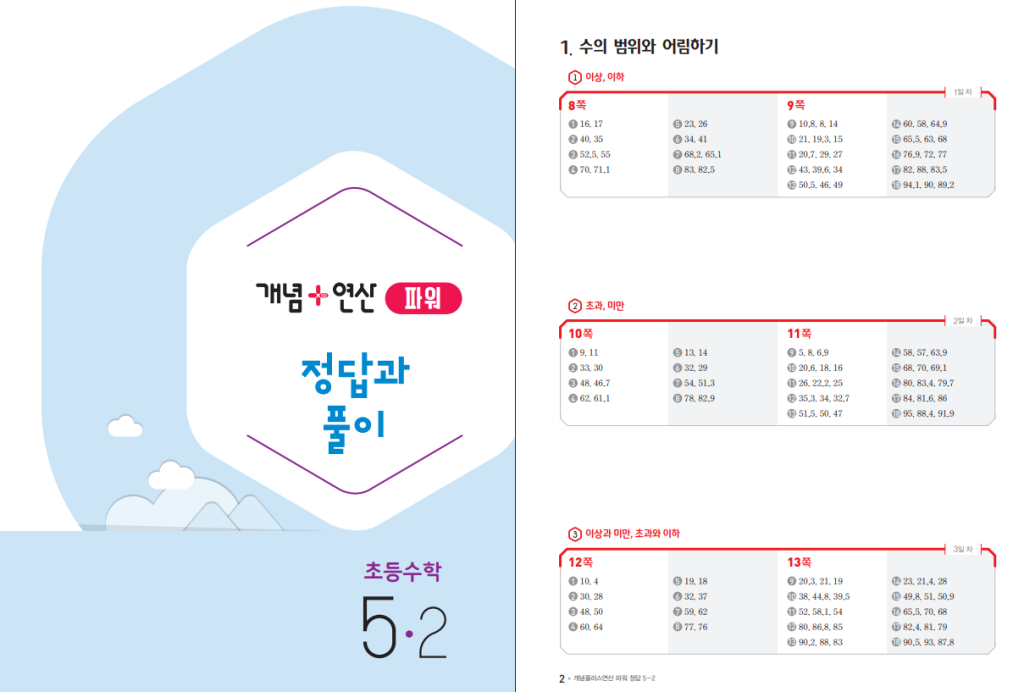 개념+연산 파워 초등수학 5-2는 조금 더 깊이 있게 공부하고 싶은 학생에게 잘 맞는 교재입니다. 단순히 계산만 반복하는 문제집이 아니라 기본 연산에서 시작해 응용 연산과 문장제까지 함께 다루는 구성이 특징입니다. 5학년 2학기에는 수의 범위와 어림하기, 분수의 곱셈, 소수의 곱셈처럼 계산 실수 하나가 전체 답에 영향을 주는 단원이 많고, 합동과 대칭이나 직육면체처럼 공간 감각과 개념 이해도 함께 필요한 내용도 나옵니다. 그래서 계산이 빠른 것만으로는 부족하고, 개념을 정확히 이해한 뒤 문제에 적용하는 힘이 중요합니다. 이 교재는 그런 흐름에 맞춰 연산 실력과 응용력까지 함께 키울 수 있도록 구성되어 있어 학기 예습용이나 복습용으로 활용하기 좋습니다. 아래 개념플러스연산 파워 5-2 답지 pdf 올려두겠습니다.
