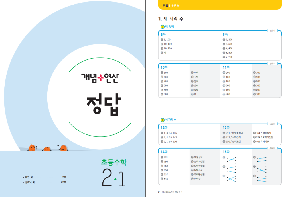 개념+연산 초등수학 2-1은 초등학교 2학년 1학기 수학을 차근차근 익히기에 알맞은 교재입니다. 이 시기의 수학은 세 자리 수, 여러 가지 도형, 받아올림과 받아내림이 있는 덧셈과 뺄셈, 길이 재기, 분류하기, 곱셈처럼 앞으로의 수학 공부에서 계속 이어지는 중요한 기초가 많습니다. 그래서 단순히 문제만 많이 푸는 책보다는 개념을 먼저 이해하고 계산으로 자연스럽게 연결해 주는 교재가 더 도움이 됩니다. 이 책은 한 컷 개념으로 아이가 부담 없이 내용을 받아들이게 하고, 바로 연산 연습으로 이어지게 구성되어 있어서 처음 배우는 내용을 정리하는 데 잘 맞습니다. 아래 개념 플러스 연산 초2-1 답지 pdf 올려두겠습니다.