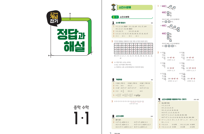 교과서 개념잡기 중학수학 1-1은 중학교 수학을 처음 시작하는 학생에게 잘 맞는 개념서입니다. 책 소개에서도 쉬운 개념 완성을 내세우고 있는데, 실제 구성도 그 방향에 맞게 잡혀 있습니다. 소인수분해, 정수와 유리수, 문자와 식, 좌표평면과 그래프처럼 중1에서 꼭 배우는 핵심 단원을 담고 있어서 학기 시작 전에 예습용으로 보기에도 좋고, 학교 진도에 맞춰 복습용으로 활용하기에도 무난합니다. 특히 참고서 난이도가 쉬움으로 안내되어 있어 수학을 어려워하는 학생도 부담을 덜 느낄 수 있습니다. 개념을 처음 접하는 단계에서 너무 어려운 문제보다 기본 흐름을 먼저 익히는 것이 중요한데, 이 교재는 그런 목적에 잘 맞는 편입니다. 아래 교과서 개념잡기 1-1 답지를 올려두도록 하겠습니다.