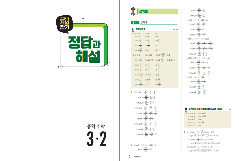 전체적으로 보면 중3 2학기 수학을 부담 없이 시작하고 싶은 학생, 교과서 개념을 중심으로 내신 대비를 차근차근 하고 싶은 학생에게 잘 어울리는 교재입니다. 아주 어려운 심화 문제를 원하는 학생보다는, 개념을 먼저 확실히 이해하고 기본 문제를 반복하면서 실수를 줄이고 싶은 학생에게 더 잘 맞습니다. 특히 삼각비나 원의 성질처럼 처음 개념이 흔들리면 문제 풀이가 어려워지는 단원을 안정적으로 정리하는 데 도움이 될 만합니다. 중학교 마지막 학기 수학을 편하게 정리하면서 학교 시험까지 준비하고 싶은 경우, 무리 없이 시작하기 좋은 실용적인 교재라고 볼 수 있습니다. 본문에 교과서 개념잡기 중3-2 답지를 올려두었습니다.