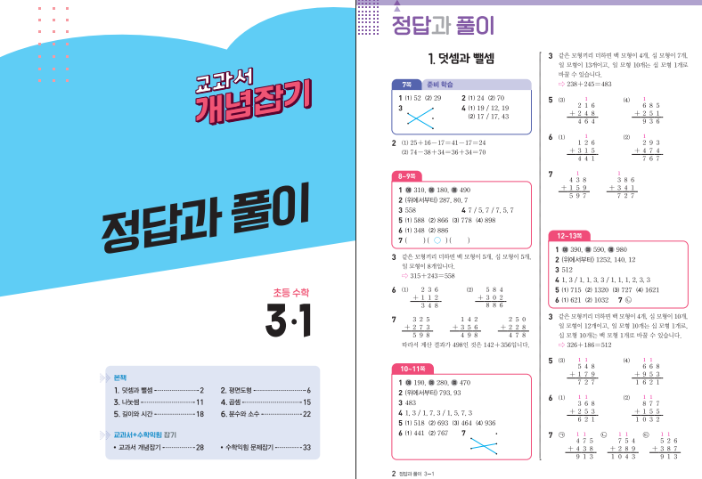 교과서 개념잡기 초등수학 3-1(2025년)은 2022 개정 교육과정을 반영하여 3학년 1학기 핵심 개념을 짧은 기간에 완성하도록 설계된 교재입니다. 한 학기 내용을 “주 5강 × 4주”의 20강 체제로 압축했으며, 수업에서 쓰는 용어와 흐름을 그대로 재구성해 학교 수업과의 연결성이 높습니다. 난이도는 하 60%, 중 40%로 구성되어 기초를 단단히 세우고 안정적으로 실력을 끌어올리기에 적합합니다. 본책은 개념과 적용 문제를 한 펼침에서 보도록 구성해 “개념 이해 → 수학익힘 적용”의 흐름을 자연스럽게 만듭니다. 아래 교과서 개념잡기 초3-1 답지 pdf 파일을 올려두도록 하겠습니다. 표지를 꼭 확인하시길 바랍니다.