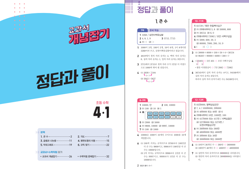 위 링크를 통해 개념잡기 4-1 답지를 열람할 수 있습니다. 단원 구성은 ‘큰 수, 각도, 곱셈과 나눗셈, 평면도형의 이동, 막대그래프, 규칙 찾기’입니다. ‘큰 수’에서는 자리값 체계를 바탕으로 읽고 쓰기, 어림과 비교를 연습합니다. ‘각도’는 각의 크기, 각도기 사용, 직·예·둔각의 분류를 정확히 익히도록 활동을 배치했습니다. ‘곱셈과 나눗셈’에서는 여러 자리 수의 계산 절차와 검산으로 연산 신뢰도를 높입니다. ‘평면도형의 이동’은 밀기·뒤집기·돌리기를 통해 대칭과 회전 감각을 키우며, ‘막대그래프’는 자료 수집–정리–해석 전 과정을 경험하게 하고, ‘규칙 찾기’에서는 수·도형의 규칙을 표와 식으로 표현하는 연습을 합니다.