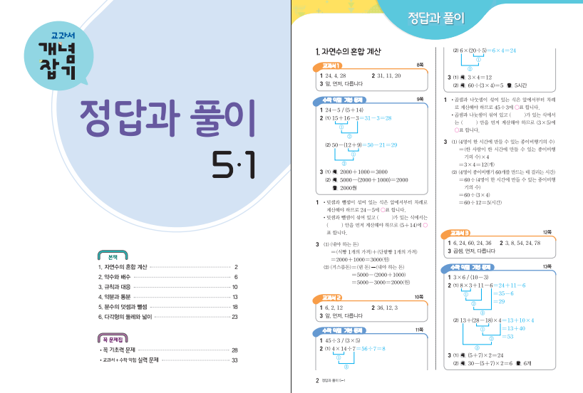 단원 구성은 자연수의 혼합 계산에서 출발해 약수와 배수, 규칙과 대응으로 사고력을 넓힌 뒤, 약분과 통분을 거쳐 분수의 덧셈과 뺄셈으로 계산 능력을 다집니다. 마지막에는 다각형의 둘레와 넓이로 도형 개념을 마무리합니다. 각 단원에서 개념 정리와 익힘 문제를 바로 이어서 제시해 막 배운 내용을 곧바로 확인하도록 돕고, 교과서 활동의 흐름을 그대로 살려 교실 수업과의 연결도 자연스럽습니다. 계산과 도형, 규칙성까지 균형 있게 다뤄 5학년 1학기의 필수 내용을 빠뜨리지 않도록 구성됐습니다.