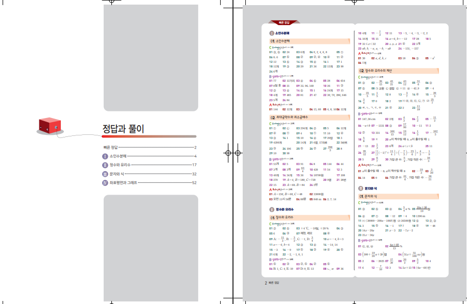 이 교재는 소인수분해를 시작으로 정수와 유리수, 문자와 식, 일차방정식, 좌표평면과 그래프까지 중1 1학기 핵심 단원을 체계적으로 다루고 있습니다. 각 단원은 핵심 개념을 간단하게 정리한 뒤 바로 다양한 문제로 이어지는 구조로 되어 있어 학습 흐름이 빠르고 효율적입니다. 문제 풀이 후 바로 해설을 확인하면서 틀린 부분을 정리하면 학습 효과를 더욱 높일 수 있습니다. 아래 링크로 수학 꽉 잡는 급속충전 A급 수학 중등 1-1 답지를 열람할 수 있습니다.