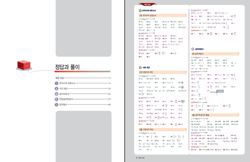 이 교재는 유리수와 순환소수를 시작으로 식의 계산, 일차부등식, 연립일차방정식, 일차함수까지 중2 1학기 핵심 단원을 체계적으로 다루고 있습니다. 각 단원은 핵심 개념을 간단하게 정리한 뒤 다양한 문제로 이어지는 구조로 되어 있어 이해와 적용이 동시에 이루어집니다. 문제 풀이 후 바로 해설을 확인하면서 틀린 부분을 정리하면 학습 효과를 더욱 높일 수 있습니다. 아래 링크로 수학 꽉 잡는 급속충전 중등 수학 2-1 답지를 열람할 수 있습니다.