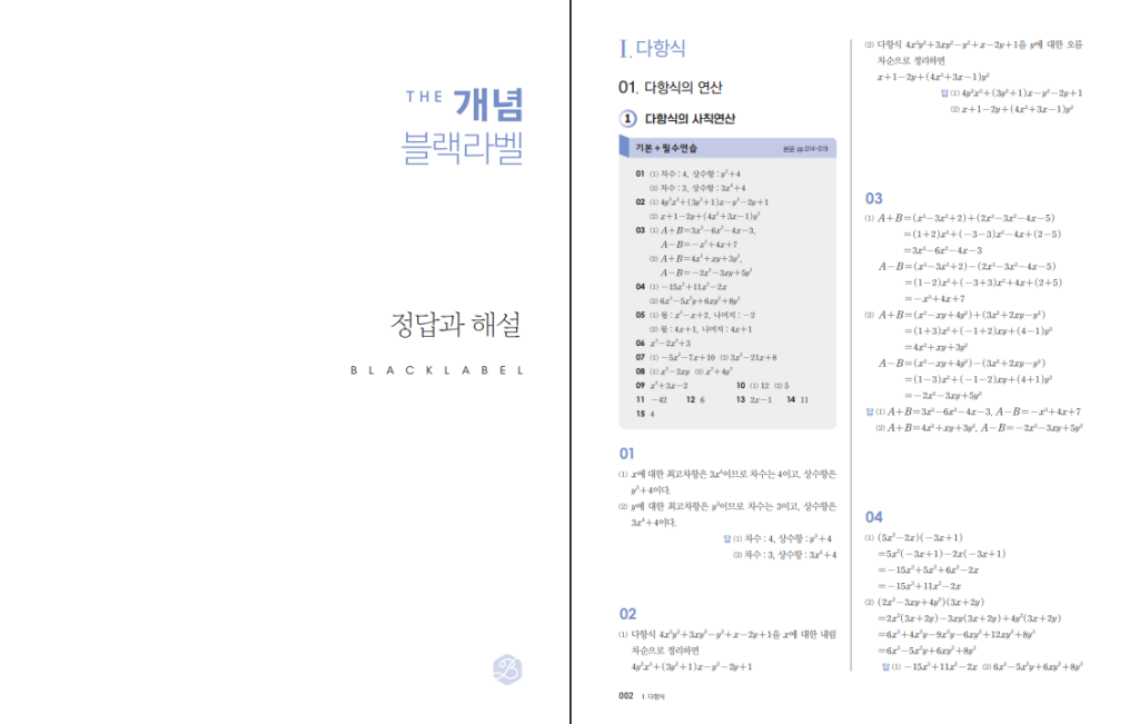 구성은 Ⅰ. 다항식(연산, 항등식·나머지정리, 인수분해), Ⅱ. 방정식과 부등식(복소수, 이차방정식, 이차함수와의 연계, 여러 가지 방정식·부등식), Ⅲ. 경우의 수(기본 원리, 순열과 조합), Ⅳ. 행렬(기본 개념과 연산)로 이어집니다. 대수 전반을 한 권으로 묶되, 이차방정식↔이차함수의 연결, 항등식↔다항식 나눗셈, 경우의 수↔식 세우기처럼 단원 간 개념을 자연스럽게 연결해 주는 흐름이 돋보입니다. 아래 링크를 통해 22개정 블랙라벨 더개념 공통수학1 답지를 열람할 수 있습니다.