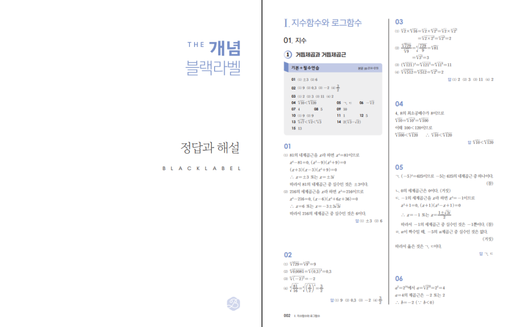 활용법은 1회독에서 각 절의 핵심 정의·성질을 여백에 한 줄로 재정의하고, 기본·필수 유형을 연속으로 풀며 오답은 “정의 혼동/조건 해석/계산 실수”로 분류합니다. 2회독부터는 발전 문제를 하루 3~5문항씩 누적하며, 로그 단원은 밑변환–스케일링–그래프 해석 루틴을, 삼각함수는 주기·위상·대칭 체크 루틴을, 수열은 귀납법의 ‘명제 설정–기초 단계–귀납 가정–귀납 증명’ 틀을 습관화하세요. 마지막으로 틀린 문제의 핵심 문장만 모아 단권화하면 내신·모평 직전 회독 효율이 급상승합니다. 대수를 개념부터 실전까지 한 번에 다지고 싶은 상위권 지향 학습자에게 알맞은 선택입니다. 본문에 더 개념 블랙라벨 대수 답지를 첨부해두었습니다. 표지를 꼭 확인하시길 바랍니다.