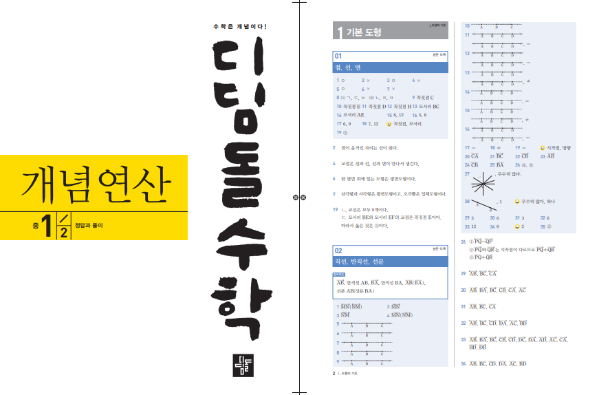 디딤돌수학 개념연산 중1-2는 중학교 1학년 2학기 수학을 부담 없이 정리하면서 개념과 연산을 함께 익히고 싶은 학생에게 잘 맞는 교재입니다. 2022 개정 교육과정을 반영한 책이며, 난이도는 보통으로 되어 있어 너무 어렵지 않게 2학기 내용을 차근차근 공부할 수 있습니다. 기본 도형, 위치 관계, 평행선, 작도와 합동부터 다각형, 원과 부채꼴, 입체도형, 통계까지 1학년 2학기에서 중요한 단원을 폭넓게 다루고 있어서 학교 진도에 맞춰 정리하기 좋습니다. 특히 중학교 수학은 초등 수학보다 개념이 더 추상적으로 바뀌는 시기라서, 처음 배우는 내용을 자연스럽게 익히는 과정이 중요한데 이 책이 그런 부분에 잘 맞습니다. 아래 디딤돌수학 개념연산 중1-2 답지 PDF 파일을 올려두도록 하겠습니다.