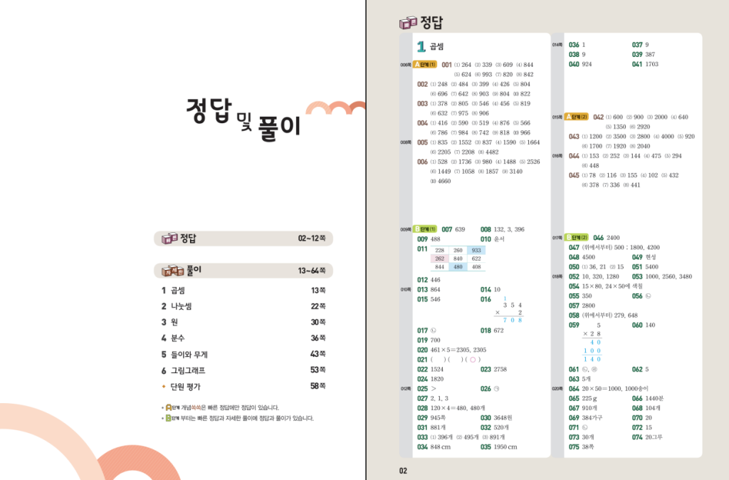 학기 마무리 단계에서는 B단계에서 공부한 유형들을 다시 재구성한 마무리GOGO를 통해 단원별 학습을 정리할 수 있습니다. 곱셈, 나눗셈, 원, 분수, 들이와 무게, 그림그래프까지 3학년 2학기 주요 단원을 골고루 다루면서, 각 단원의 핵심 개념과 대표 문제를 다시 한 번 점검할 수 있도록 구성되어 있습니다. 권말부록에서는 시험 전에 자신의 실력을 점검할 수 있는 평가용 문제들이 제공되어 학교 단원평가나 수학 시험을 준비하는 데 실질적인 도움을 줍니다. 이러한 흐름 덕분에 교과 진도에 맞춰 풀어 가면 자연스럽게 한 학기를 정리하는 구조가 됩니다.