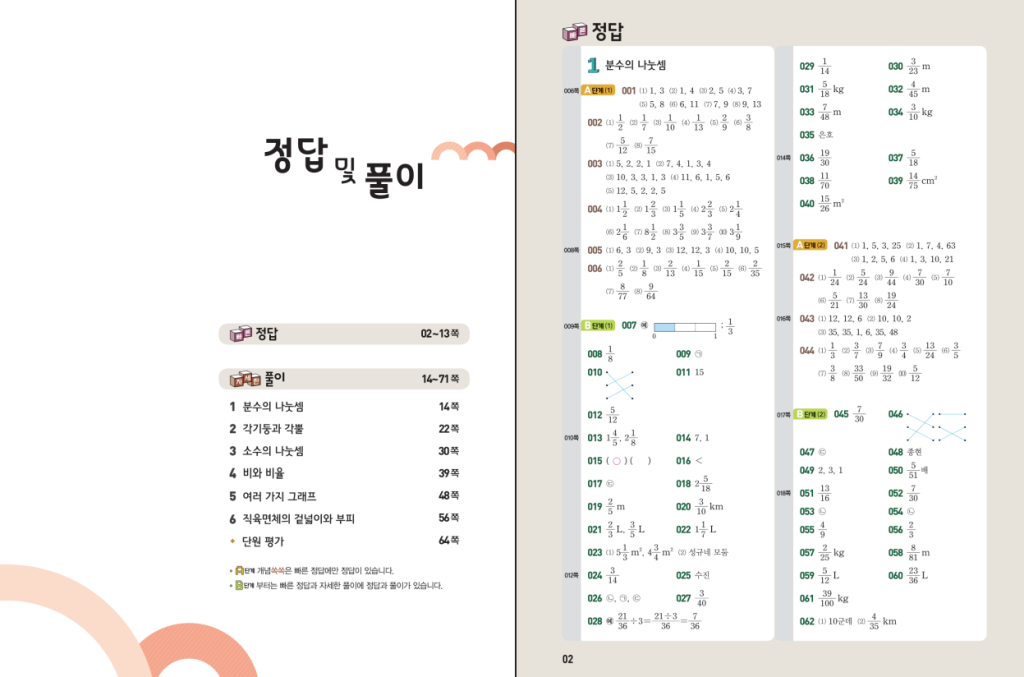 단원 구성은 6학년 1학기에서 꼭 짚어야 할 내용을 빠짐없이 담고 있습니다. 분수의 나눗셈 단원에서 분수 계산의 마지막 단계를 정리하고, 각기둥과 각뿔 단원에서 입체도형의 모양과 전개도, 밑면과 높이 개념을 익힙니다. 이어서 소수의 나눗셈으로 소수 계산을 마무리하고, 비와 비율 단원에서 중학교 비례식, 함수 개념으로 이어지는 기초를 쌓게 됩니다. 여러 가지 그래프 단원에서는 막대그래프, 꺾은선그래프 등 다양한 그래프 읽기와 해석을 연습하고, 직육면체의 겉넓이와 부피 단원에서는 공식 이해와 함께 실제 생활 문제에 적용하는 연습을 하도록 구성되어 있습니다.