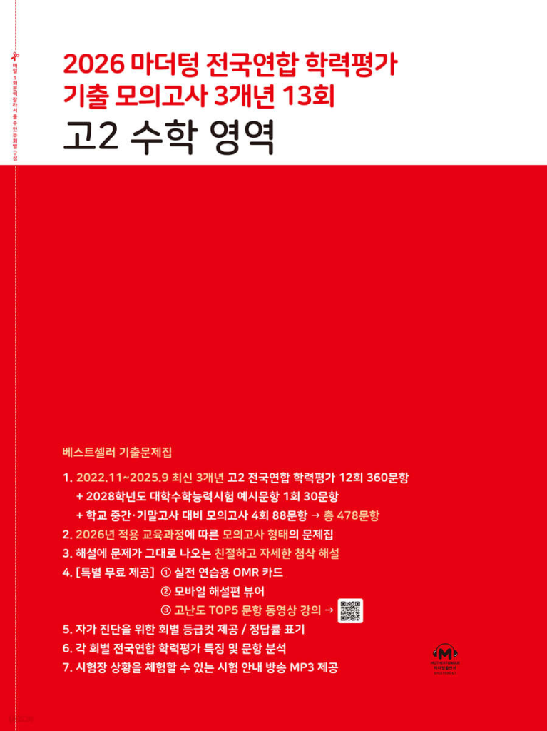 활용할 때는 회차를 풀기 전부터 규칙을 정해두면 효과가 커집니다. 예를 들어 1회분을 정해진 시간에 맞춰 풀고, 채점은 바로 하되 오답 정리는 다음 날까지 끝내는 식으로 루틴을 만들면 점수가 더 안정적으로 올라갑니다. 오답을 볼 때는 해설을 따라가기만 하지 말고, 내가 틀린 이유가 계산 실수인지, 개념 구멍인지, 시간 부족인지 한 줄로라도 표시해 두는 것이 좋습니다. 답지(정답과 해설)는 보통 책 뒤쪽에 정리되어 있으니, 채점용으로만 쓰지 말고 “내가 다음에 같은 유형을 만나면 어떤 순서로 풀지”까지 정리해두면 회차를 돌릴수록 실력이 쌓입니다. 본문에 빨간책 마더텅 전국연합 학력평가 기출 모의고사 3개년 13회 고2 수학 영역 (2026년) 답지 파일을 첨부해두었습니다. 표지를 꼭 확인하시길 바랍니다.