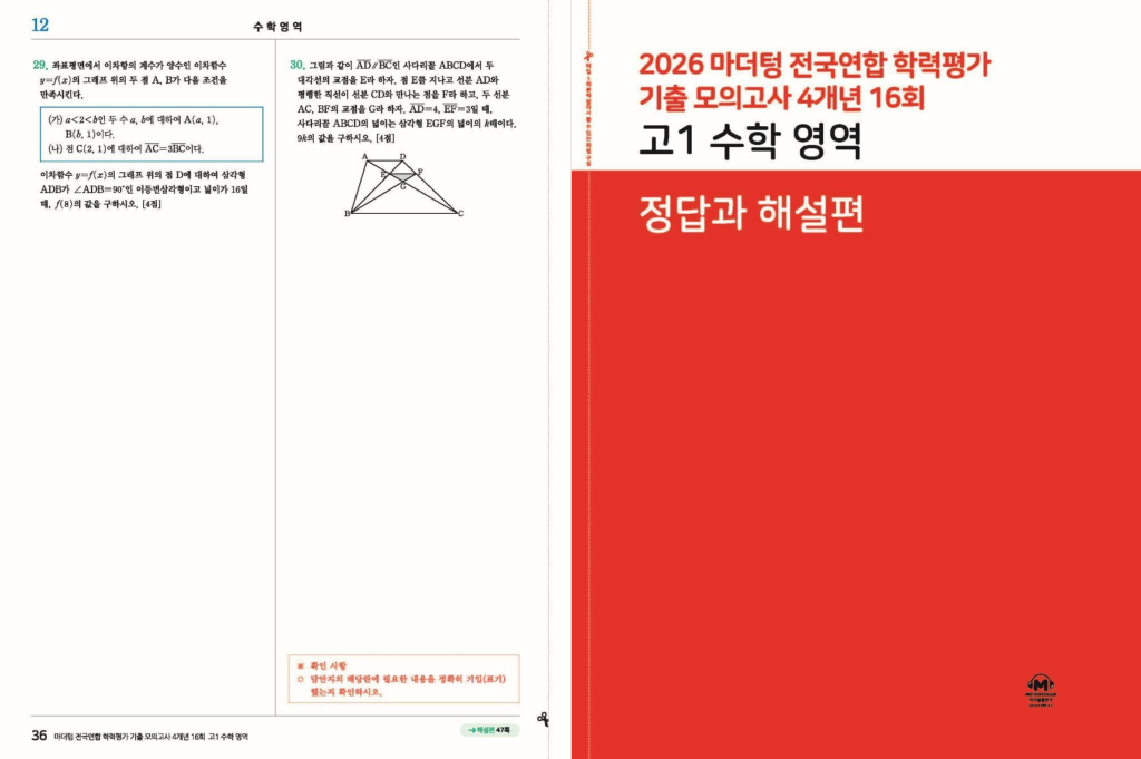 마더텅 전국연합 학력평가 기출 모의고사 4개년 16회 고1 수학 영역(2026년)은 고1이 전국연합 학력평가를 준비할 때 “시험처럼 풀어보는 연습”을 제대로 하게 만들어 주는 교재입니다. 수학은 개념을 아는 것과 시험에서 점수를 받는 것이 다를 때가 많은데, 그 차이를 줄이려면 제한 시간 안에서 문제를 골라 풀고, 실수 패턴을 바로잡는 훈련이 필요합니다. 이 책은 실제 기출 기반이라서 문제의 분위기와 난이도 흐름이 현실적이고, 한 번 풀어보고 끝내는 문제집이 아니라 “회차별 실전 루틴”을 만들기 좋습니다. 특히 예비 고1이나 고1 초반처럼 아직 시험 감각이 덜 잡힌 시기에 시작하면, 수학 공부가 막연하지 않고 방향이 또렷해지는 편입니다. 아래 마더텅 빨간책 고1 수학 모의고사 16회 답지 pdf 파일을 첨부해두도록 하겠습니다.