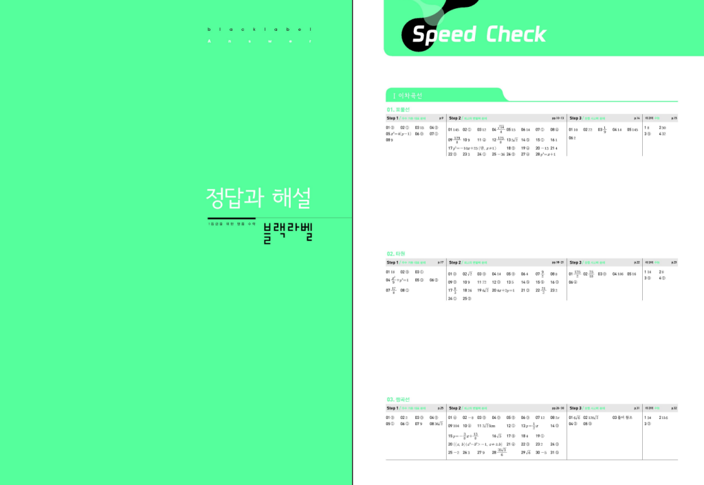 구성의 Ⅰ부 ‘이차곡선’은 포물선·타원·쌍곡선의 정의와 표준형, 초점·준선 성질을 체계적으로 다루어 접선, 최단거리, 영역 넓이 등 응용으로 연결합니다. 완전제곱과 좌표 평행이동으로 식을 표준형으로 정리하는 루틴을 반복하도록 설계되어 계산 실수를 줄이는 데 효과적입니다. 조건을 도형에서 대수로 빠르게 전환하는 훈련이 풍부해, 그래프 해석과 방정식 설정 속도도 함께 향상됩니다. 이 파트만 탄탄히 해도 좌표기하 전반의 득점력이 눈에 띄게 안정됩니다. 아래 링크를 통해 기하 블랙라벨 답지를 열람할 수 있습니다.