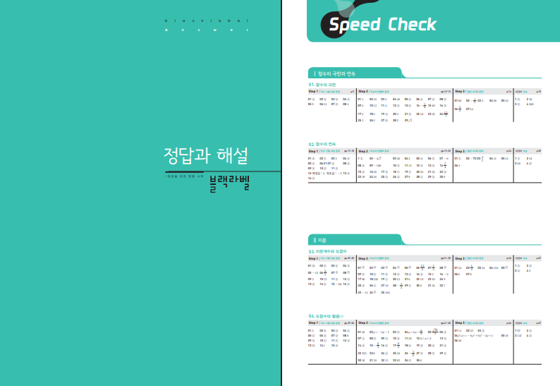 권장 활용법은 1회독에서 각 절의 정의·성질을 한 줄 메모로 재진술하고, 극한·연속은 그래프를 직접 그려 시각화를 습관화하길 권합니다. 오답은 ‘조건 해석/공식 선택/계산’으로 분류해 원인별 재풀이를 하고, 2회독은 변별력·종합사고 세트를 시간 제한으로 연속 풀이해 체력을 길들이면 효과적입니다. 미분–적분 연결 문제는 “모형 설정 → 식 세우기 → 부호·단위 검산” 체크리스트로 마무리하면 안정적인 점수화가 가능하니, 내신 상위권 유지와 수능 실전 감각 동시 강화를 노리는 학생에게 특히 적합하다고 판단됩니다. 본문에 수2 블랙라벨 답지 PDF 파일을 첨부해두었습니다. 교육과정이 바뀌고 있으므로 표지를 꼭 확인하시길 바랍니다.