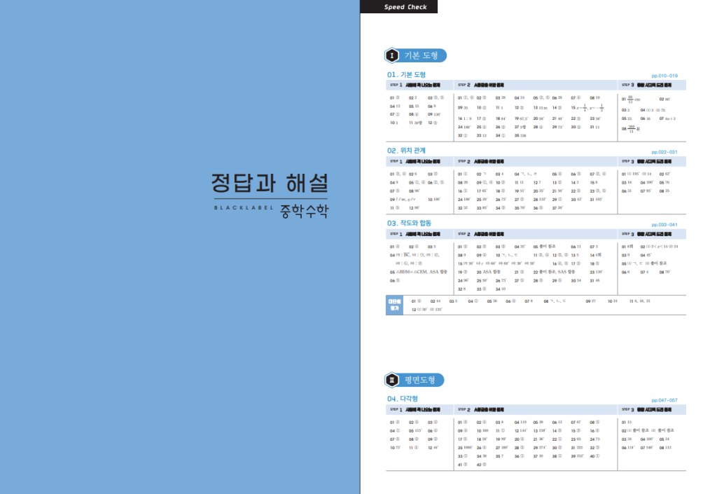 평가 설계와 해설 품질도 우수합니다. 대단원평가는 소요 시간을 제시해 실제 시험처럼 연습할 수 있고, 해설서는 정답 근거·풀이 실마리·오답 포인트를 체계적으로 짚는 ‘BLACKLABEL 특강’ 형식으로 자기주도 학습에 적합합니다. 다각형·원과 부채꼴, 입체도형의 겉넓이·부피, 도수분포표·상대도수 등 2학기 핵심 테마의 시각화와 자료 해석 훈련이 탄탄하여 내신과 더불어 사고력형 문항 대응력을 동시에 강화할 수 있습니다.