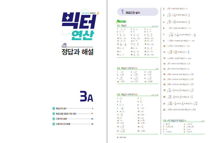 이 교재는 제곱근과 실수를 시작으로 제곱근을 포함한 식의 계산, 다항식의 곱셈, 다항식의 인수분해까지 중3 1학기 핵심 연산 단원을 체계적으로 다루고 있습니다. 개념을 세분화하여 설명한 뒤 바로 연산 문제로 이어지는 구조이기 때문에 이해와 반복 학습이 동시에 이루어집니다. 문제 풀이 후 바로 해설을 확인해보시면 학습 효과를 더욱 높일 수 있습니다. 아래 링크로 빅터 연산 중학 수학 3A 답지를 열람할 수 있습니다.