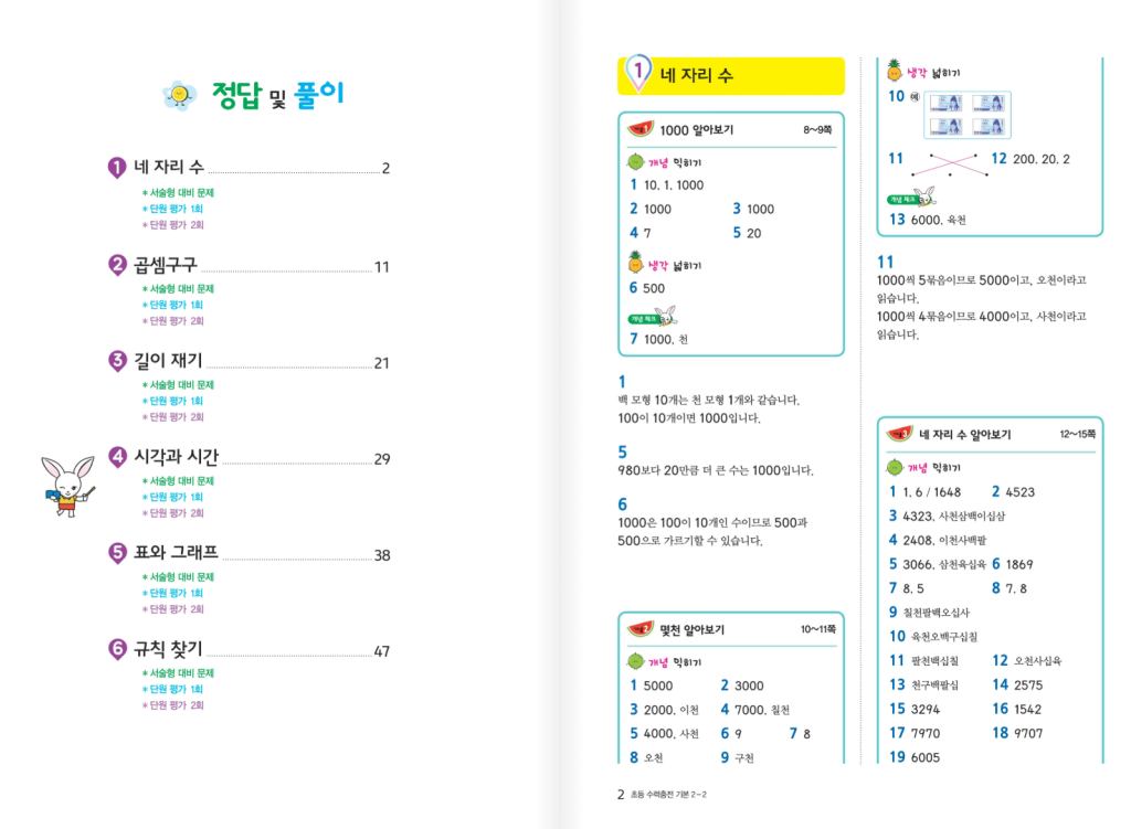 2-2의 단원은 네 자리 수로 수 범위를 넓히며 시작하고, 곱셈구구로 계산의 기초를 탄탄히 잡습니다. 이어서 길이 재기에서 단위를 정확히 쓰는 습관을 들이고, 시각과 시간 단원에서 시계 읽기와 시간 계산을 연습합니다. 그 다음 표와 그래프로 자료를 읽고 정리하는 방법을 배우고, 마지막 규칙 찾기로 패턴을 발견하고 식으로 표현하는 힘을 키우게 됩니다. 아래 링크로 수력충전 초등수학 2-2 답지를 열람하실 수 있습니다.