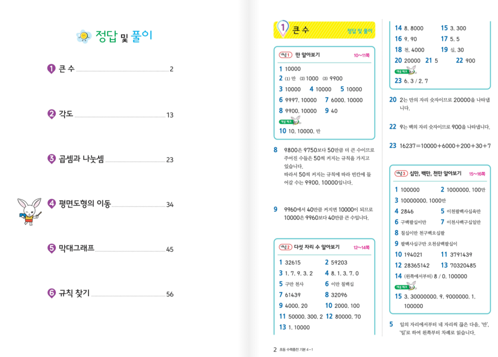 목차 흐름도 4학년 1학기 핵심을 그대로 잡고 있습니다. 1단원 큰 수에서는 자리값을 정확히 이해하고 읽기·쓰기·비교를 안정적으로 해야 뒤 단원에서 실수가 줄어듭니다. 2단원 각도는 ‘몇 도인지 재는 법’뿐 아니라, 각의 크기를 말로 설명하고 그림에서 찾아내는 연습이 중요합니다. 3단원 곱셈과 나눗셈은 3학년에서 배운 계산을 더 큰 수로 확장하는 구간이라, 계산 과정이 길어지면서 실수가 늘기 쉬워서 단계별로 정리하는 습관이 필요합니다. 4단원 평면도형의 이동은 뒤집기, 돌리기, 밀기처럼 움직임을 머릿속으로 상상해야 해서 처음엔 어렵게 느껴질 수 있는데, 이때는 그림을 따라 그려 보면서 규칙을 잡는 것이 도움이 됩니다. 5단원 표와 그래프는 자료를 읽고 해석하는 힘을 키우는 단원이라, 제목과 기준을 놓치지 않는 습관이 핵심입니다. 6단원 규칙 찾기는 앞에서 배운 수와 연산, 표 읽기까지 연결되기 때문에, 처음부터 차근차근 쌓아 온 학생이 확실히 유리합니다.