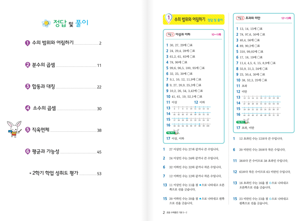 이 책은 기본 개념을 반복해서 몸에 붙이는 구성이어서 학교 진도와 맞춰 꾸준히 풀기 좋습니다. 서술형 대비와 단원 평가까지 이어지기 때문에 시험 대비로 마무리하기도 편하고, 강의와 함께 병행하면 이해가 더 단단해져서 매우 좋습니다. 매년 개정되므로 표지 확인을 꼭 하실 바랍니다. 본문에 22개정 수력충전 기본 초등 수학 5-2 답지 pdf 첨부해 두었습니다. 필요하신 분들은 이용하시길 바랍니다.