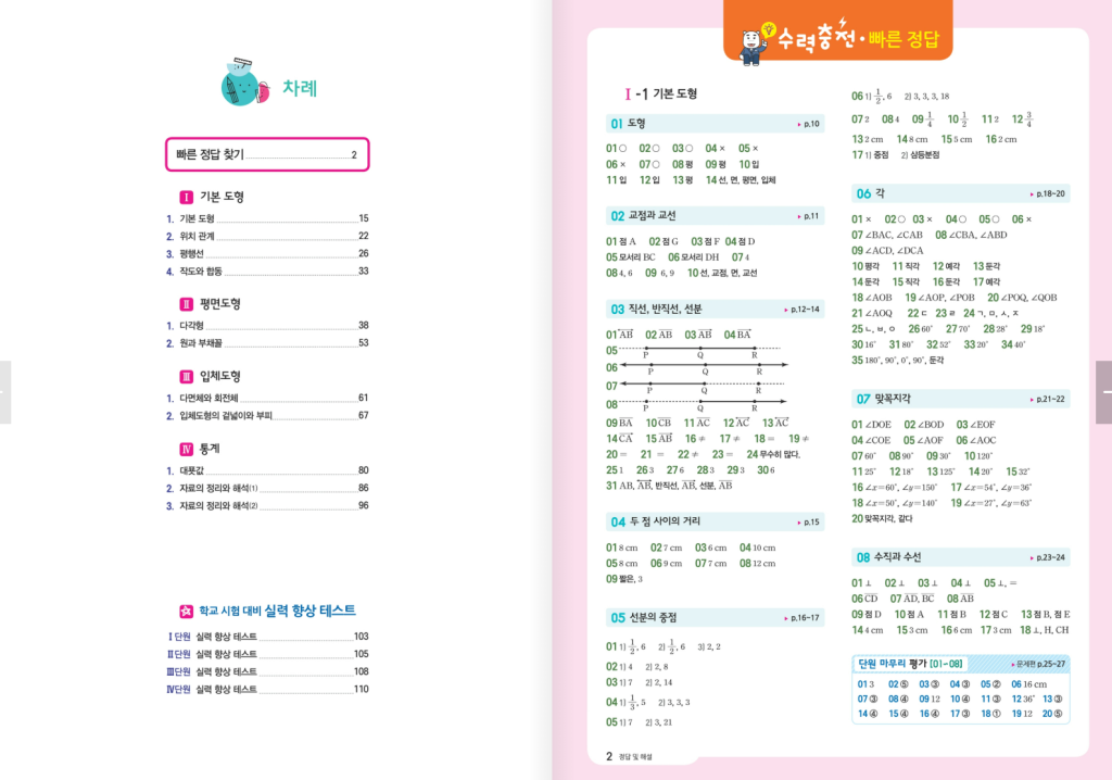 구성은 기본 도형에서 시작해 위치 관계, 평행선, 작도와 합동으로 이어지면서 도형의 언어를 익히게 합니다. 그다음 평면도형에서는 다각형과 원과 부채꼴을 다루고, 입체도형에서는 다면체와 회전체, 겉넓이와 부피까지 연결되어 공간감과 공식 활용을 함께 연습하게 됩니다. 마지막 통계 파트는 대푯값부터 자료를 표나 그래프로 정리하고 해석하는 내용이 들어가서, 문제를 읽고 의미를 파악하는 연습에 도움이 됩니다. 아래 링크로 중1-2 수력충전 답지를 열람할 수 있습니다.