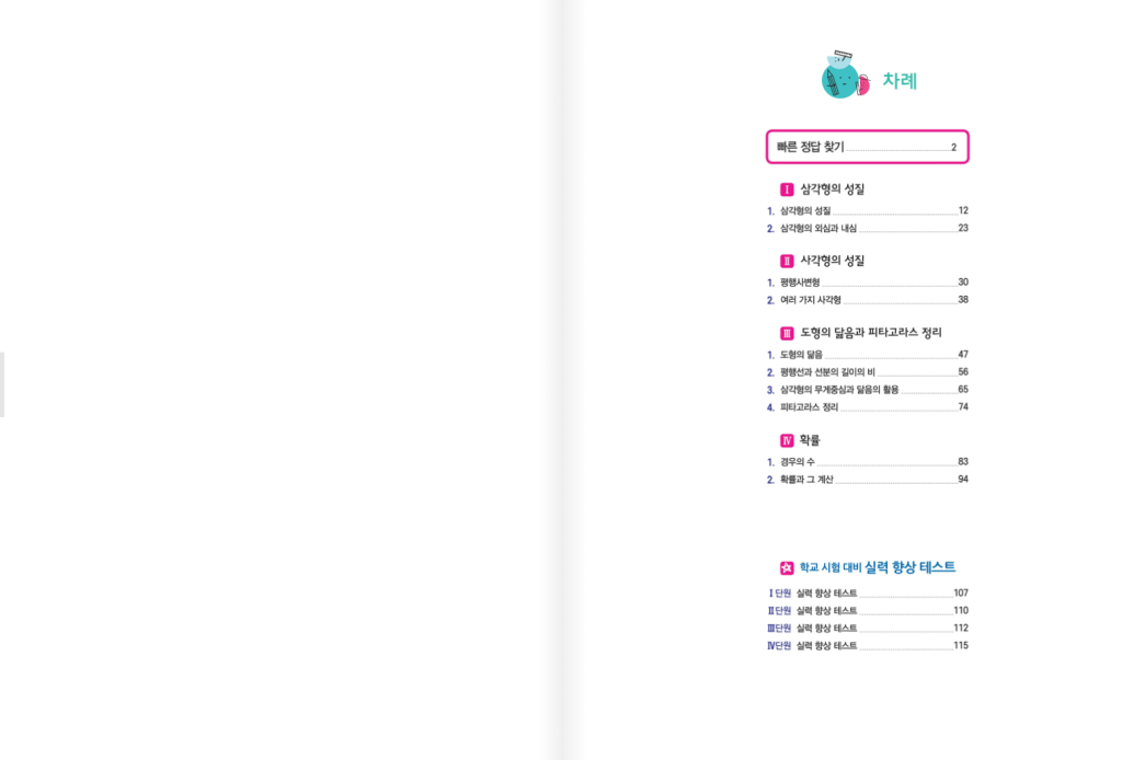 이 책의 특징은 개념 이해 문제 다음에 기초 유형 연산을 충분히 쌓아주고, 빈칸 채우기나 단계별 과정 완성처럼 풀이 흐름을 스스로 따라가게 만든다는 점입니다. 도형 단원은 특히 풀이 과정이 길어지기 쉬운데, 과정이 흔들리면 답이 맞아도 설명이 틀려서 감점되는 경우가 생깁니다. 그래서 서술형 느낌으로 한 단계씩 쓰게 하는 구성이 도움이 됩니다. 단원 마무리 평가 문제는 학교 시험에서 자주 나오는 기본 문제를 정리해 주고, 실력 향상 테스트는 잘 틀리는 유형을 다시 점검하게 해 주는 역할을 합니다.